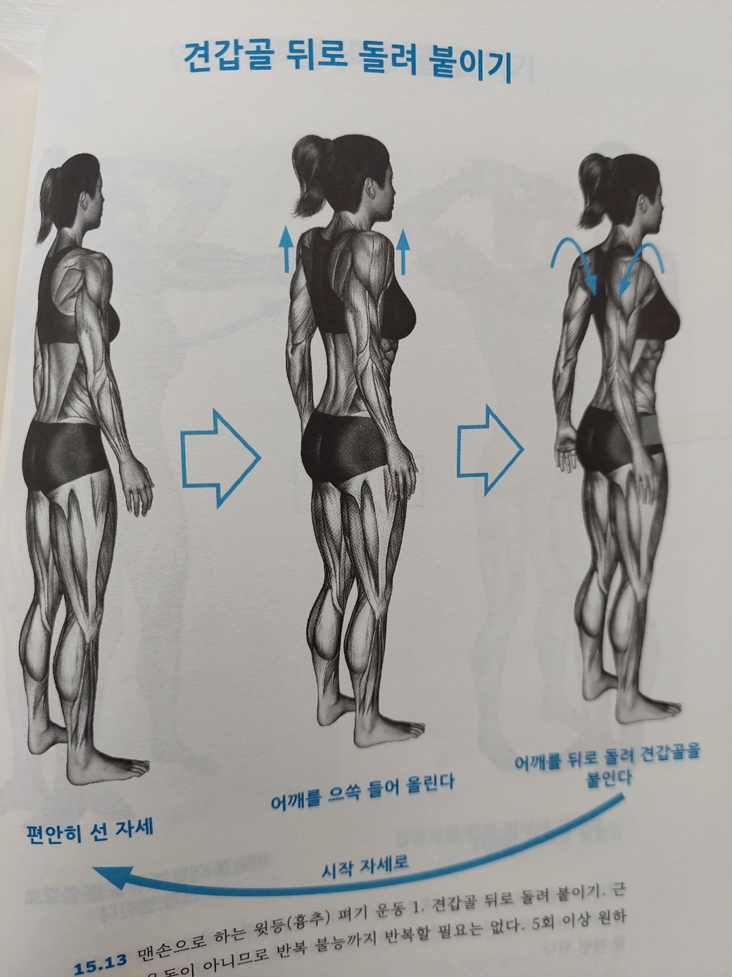 이 책에 나오는 하지 4개의 하지 말라는 동작 중에서 승모근 강화 운동이 의외입니다. 이에 대해 알아보자면, 승모근에 강한 힘을 가하면 뒤통수뼈에 붙은 상부 승모근의 수축으로 목 디스크에 심한 압박을 가하여 목 디스크 상처가 재발할 우려가 있다고 합니다. 그래서 목 디스크 증상이 있을 때는 하지 않고 평생 하지 않는다고 단언하기보다는 통증이 완전히 사라지면 조금씩 시도해보고 운동으로 인한 목 디스크 증상이 없어야 한다고 합니다.