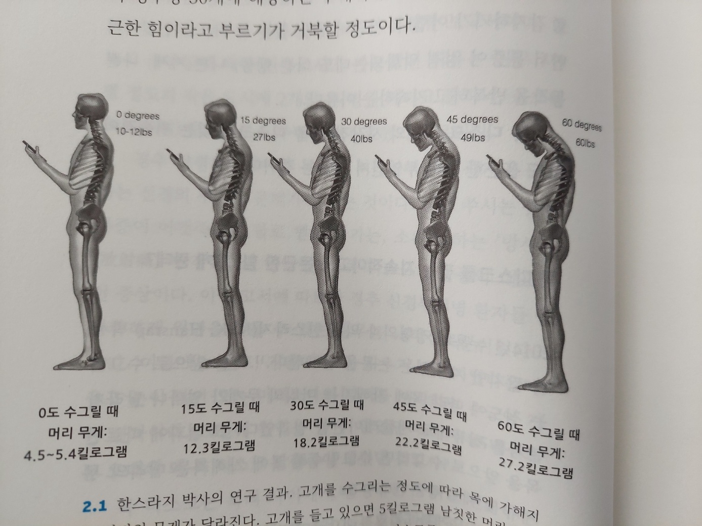 목을 앞으로 수그리는 정도에 따라 목에 가해지는 머리의 무게는 몇 배로 증가합니다. 머리 무게를 5킬로그램으로 가정할 때 고개를 15도 수그리면 12.3킬로그램, 30도 수그리면 18.2킬로그램, 45도 수그리면 22.2킬로그램, 60도 수그리면 27.2킬로그램의 무게를 느끼게 된다는 것입니다. 책에서는 이쯤 되면 더 이상 목을 수그리는 힘이 은근한 힘이라고 부르기가 거북할 정도라고 표현합니다.
