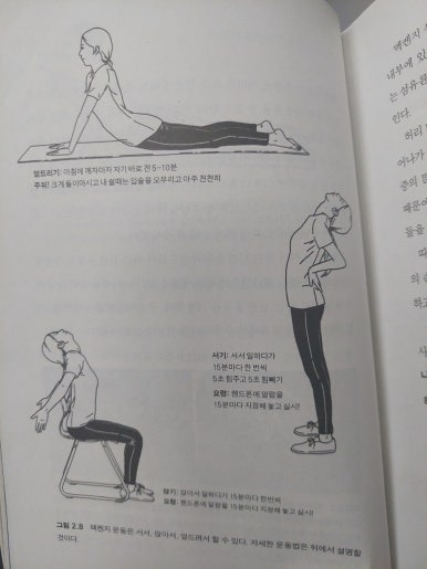 백년허리에서 추천하는 이른바 멕켄지 운동입니다. 첫번째 동작은 필라테스에서 스완이라고 불리는 동작입니다. 이를 다양한 기구에서 할 수 있습니다. 이 책에 깊게 공감하는 부분 중 하나는 현대인들은 스마트폰, 노트북 등으로 인해 구부러진 몸을 펼 시간이 없습니다. 이러한 신전운동들과 스트레칭을 틈틈히 하는 것에 적극 찬성합니다.