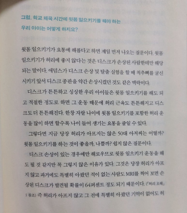 백년허리에 따르면 윗몸일으키기가 허리에 좋지 않다는 것은 디스크가 손상된 사람한테만 해당되는 말 입니다. (이하생략) 적절한 정도로 하면 그 운동 때문에 허리 근육도 튼튼해지고 디스크도 더 튼튼해집니다. 한창 자랄 나이에 윗몸 일으키기를 포함한 허리 운동을 많이 하면 할수록 나이 들어 생기는 요통을 줄일 수 있습니다.